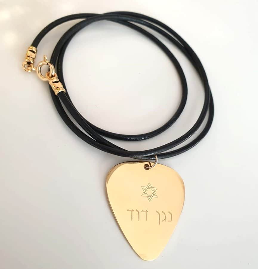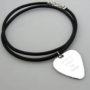 שרשרת עשויה מעור כולל תליון מפרט לגיטרה כולל הקדשה אישית.